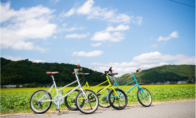 おしゃれなレンタルバイクで、田園宿場町福住の爽やかな風を感じながら駆け抜けてみてください。田んぼを走る風や虫の声、川のせせらぎもとても近く、素朴に聞こえてくるはずです。レンタルバイクはスイスの自転車ブランド「BRUNO」のミニヴェロ。ペダルも軽く、女性にも安心です。